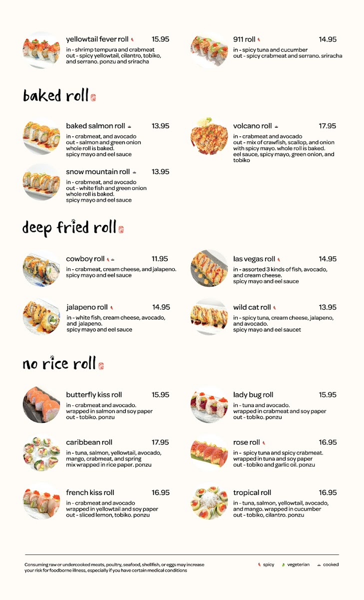 The ramen section offers comforting bowls such as the rich Tonkotsu Ramen, the refreshing Shio Ramen, and the hearty Miso Ramen, each providing its own unique blend of flavors. For those looking for sushi rolls without rice, the No Rice Rolls category includes refreshing options like the Caribbean Roll, LadyBug Roll, and Tropical Roll.